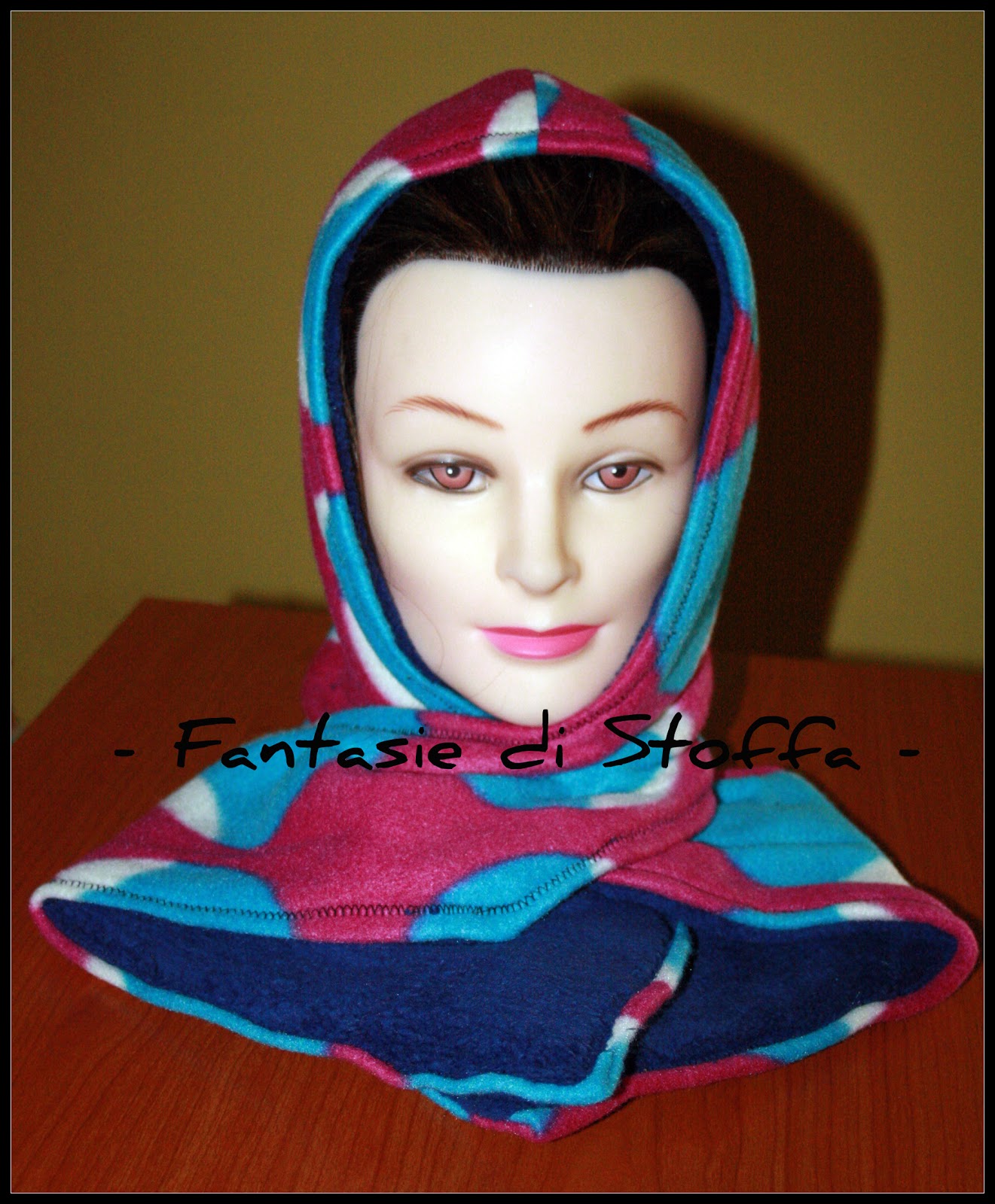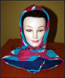 Seconda sciarpa col cappuccio, doubleface, in pile fantasia (celeste, fuxia, bianco), pile "coral" blu/viola: